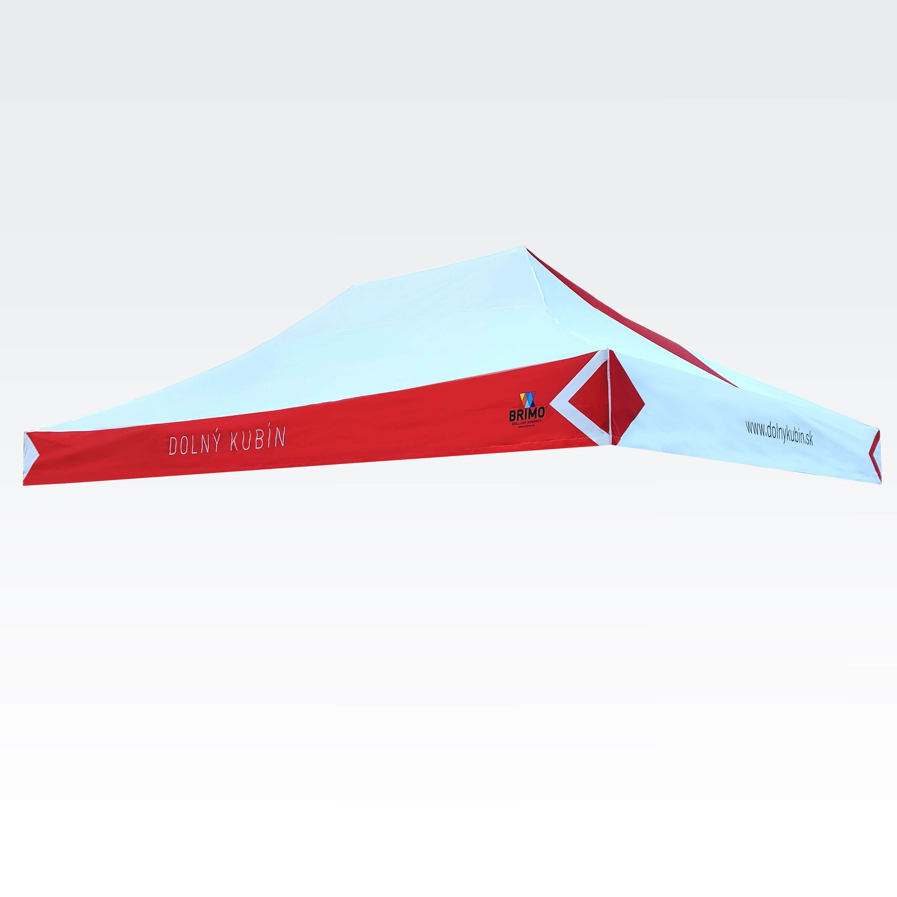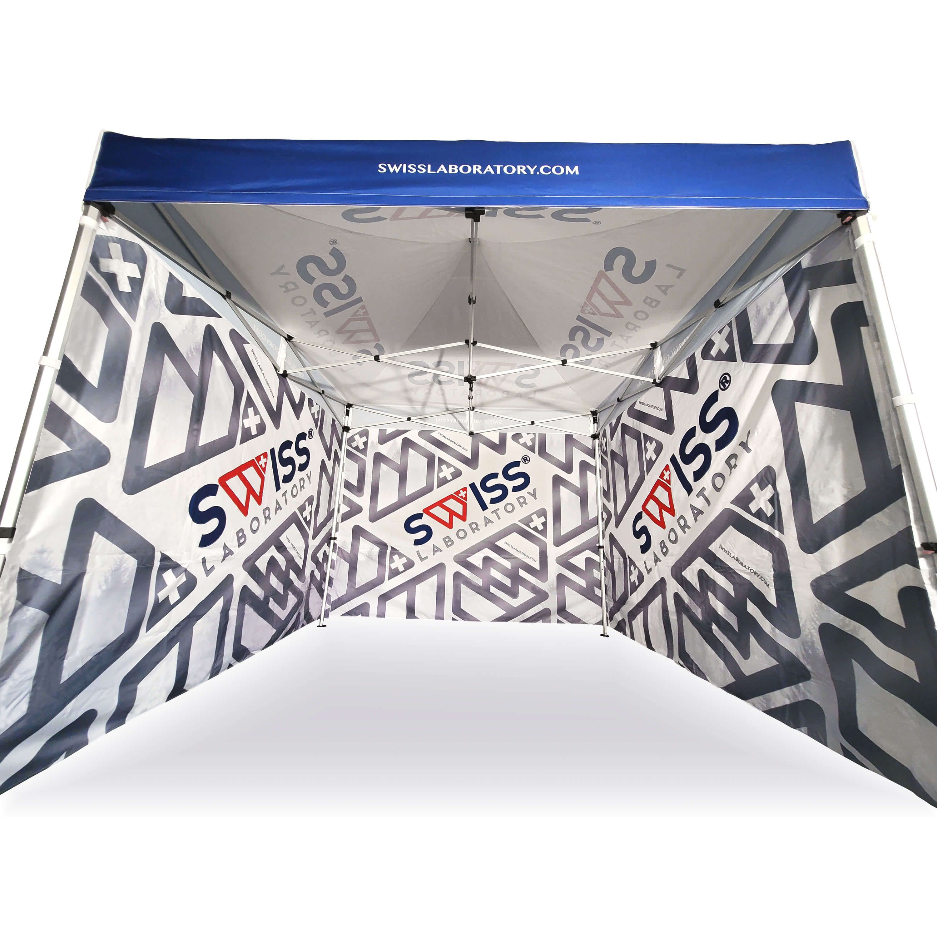 Gazebo pubblicitari con stampa digitale a sublimazione. La stampa avviene tramite un processo chimico in cui l'inchiostro, sotto l'effetto dell'alta temperatura, penetra direttamente nella struttura del tessuto. Logo, scritta o qualsiasi tipo di grafica sul lato interno o esterno del gazebo, secondo le richieste del cliente.