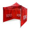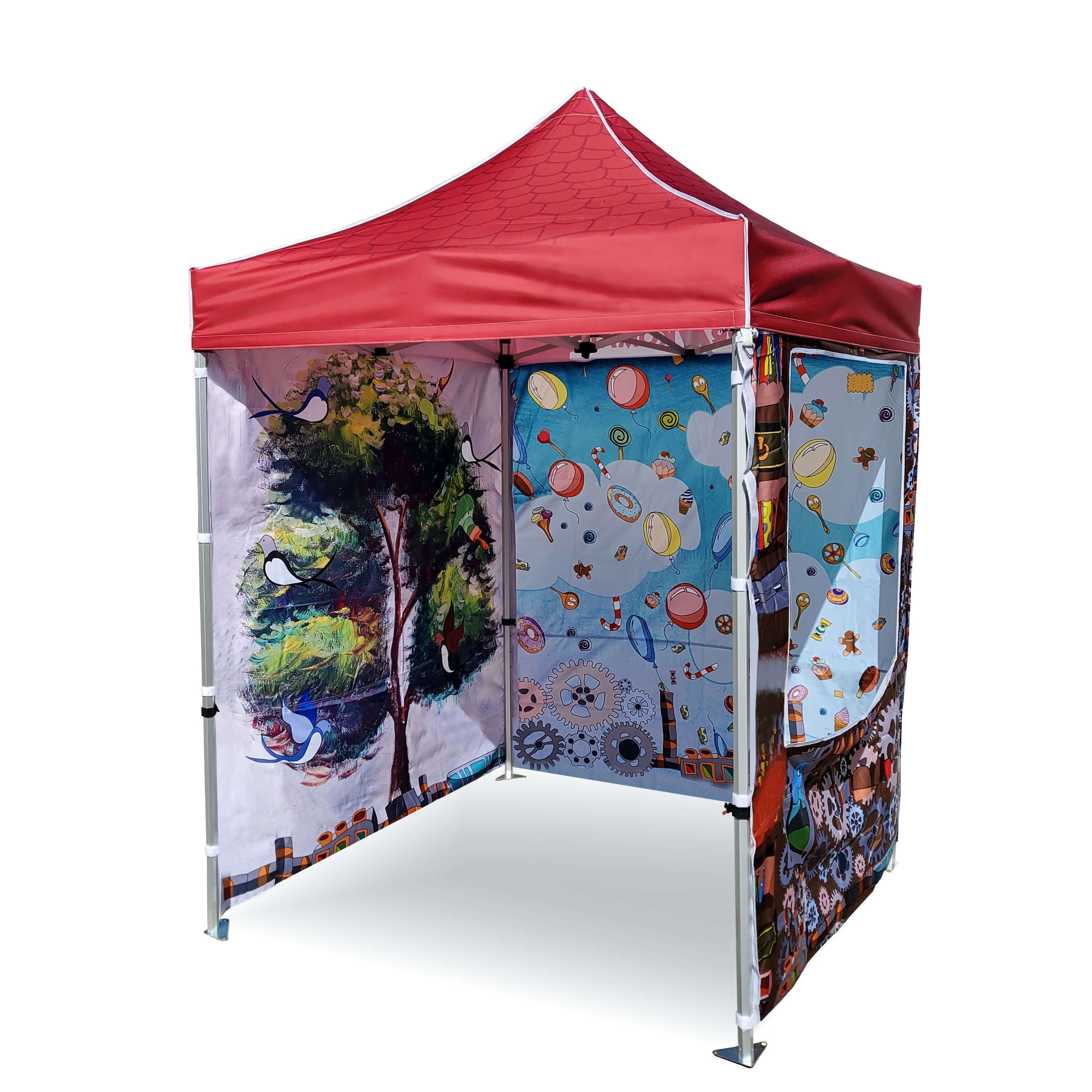 I colori sono molto vivaci, questo metodo riflette perfettamente ogni dettaglio sui gazebo pubblicitari. I colori vivaci attirano lo sguardo, e la sublimazione garantisce un utilizzo prolungato senza perdita di colore. In questo metodo, il prezzo rimane invariato indipendentemente dalla dimensione della stampa (la dimensione della stampa non influisce sul prezzo, il costo delle pareti o del tetto rimane invariato). Più grande è la stampa, più visibile sarà la pubblicità.